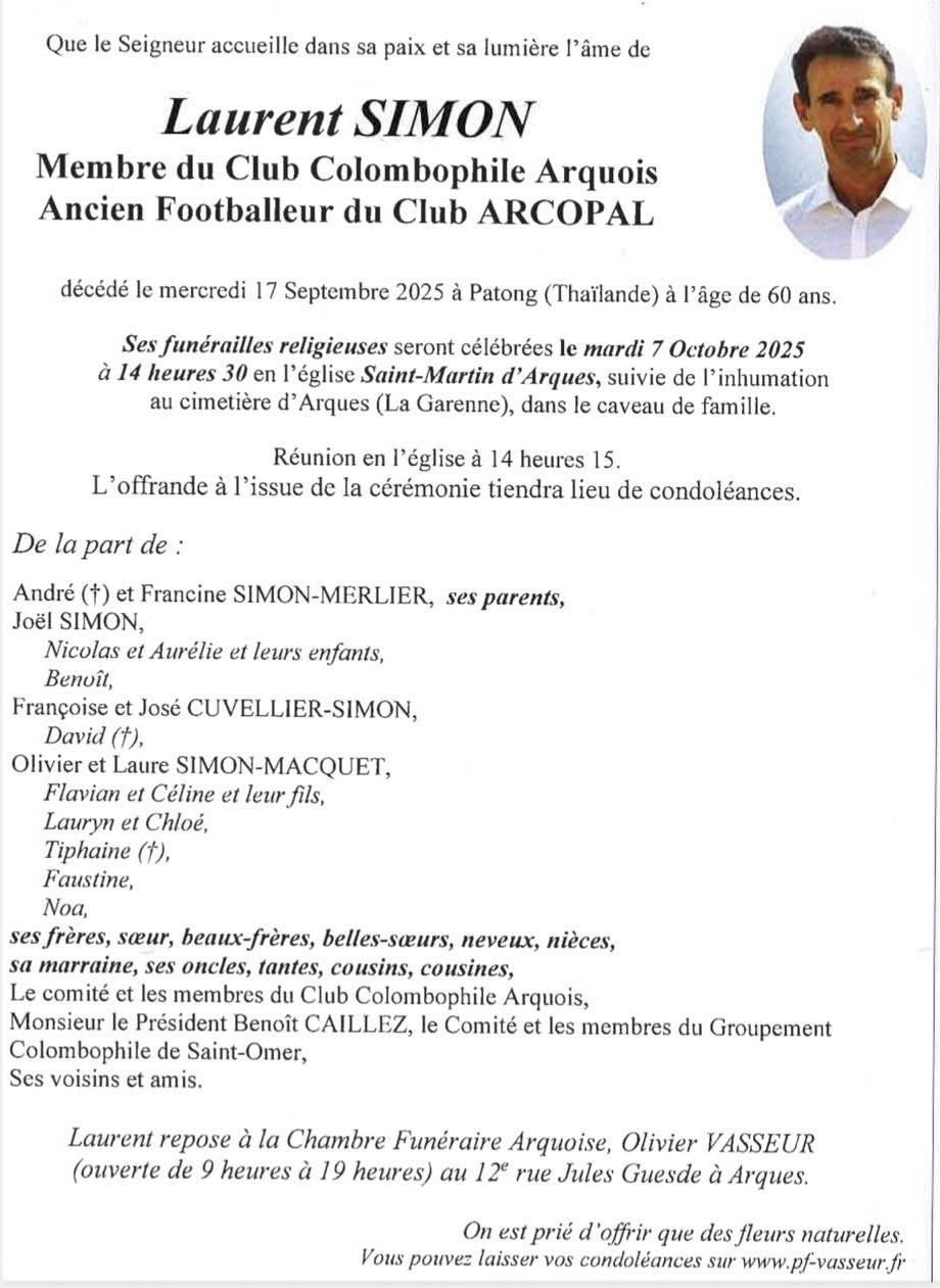 Colombophile arquois tragiquement disparu en Thaïlance, Laurent Simon sera inhumé ce mardi. Voir le faire-part.